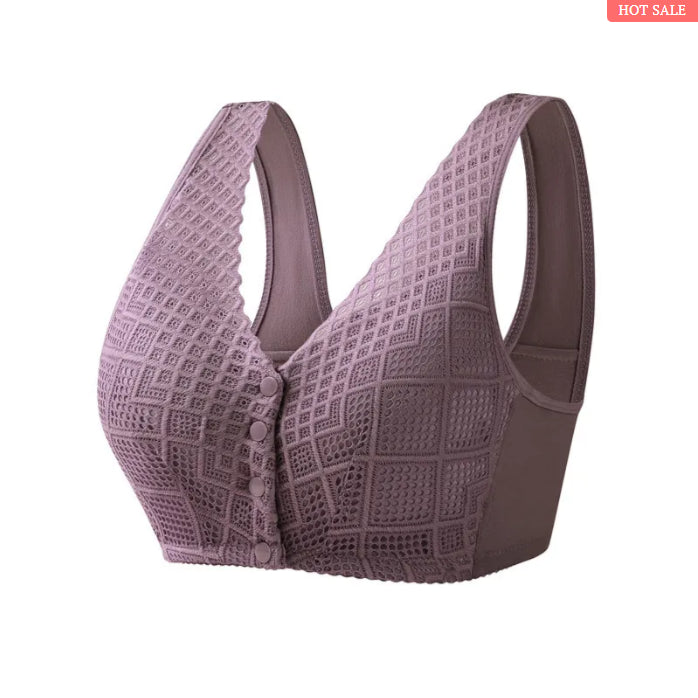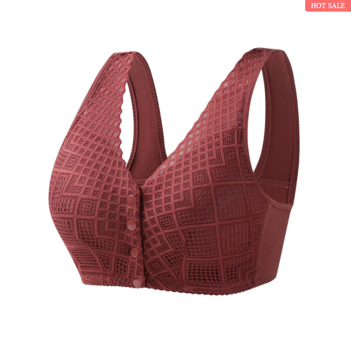 Der Button Bra ist weich, breit und leicht gepolstert. Sein U-förmiger Rücken bietet Halt und ganztägigen Schutz, ohne Beulen und Rückenschmerzen zu hinterlassen. Der Verschluss auf der Vorderseite sorgt für ein einfaches Anziehen und eine gute Passform.